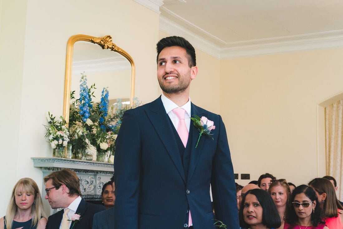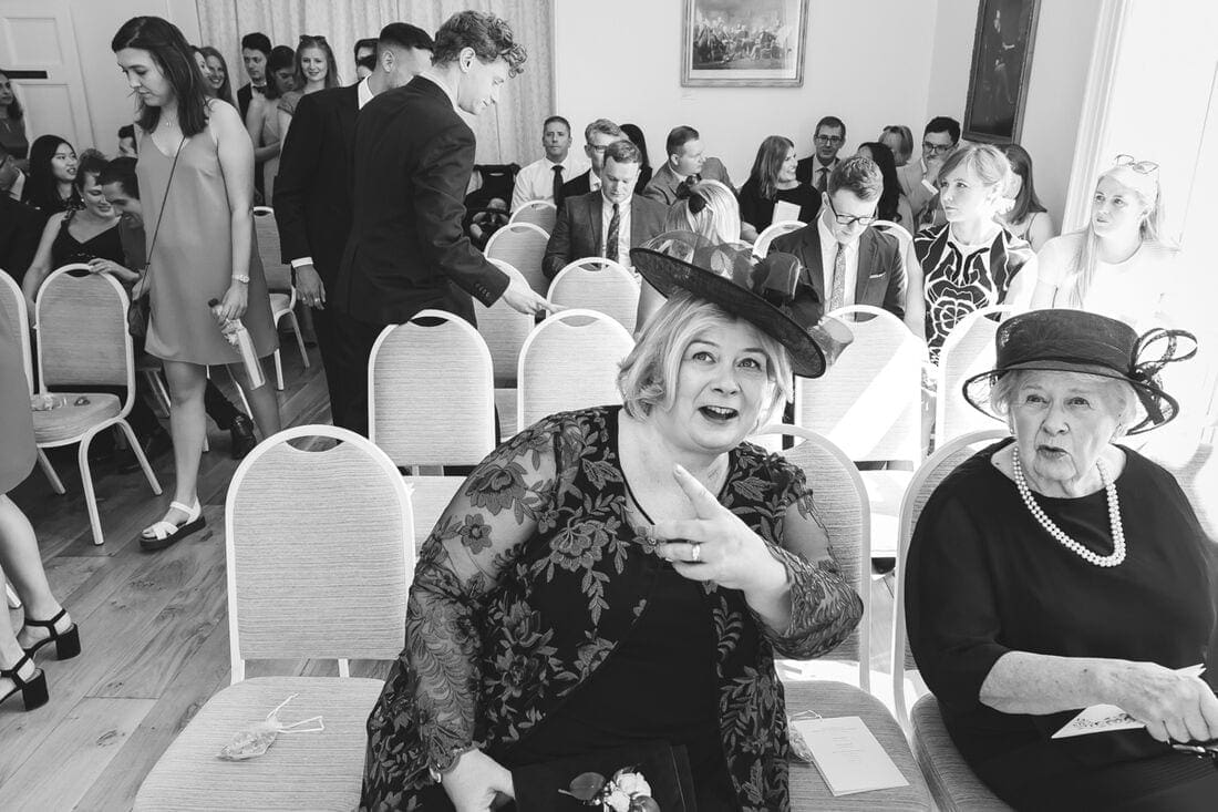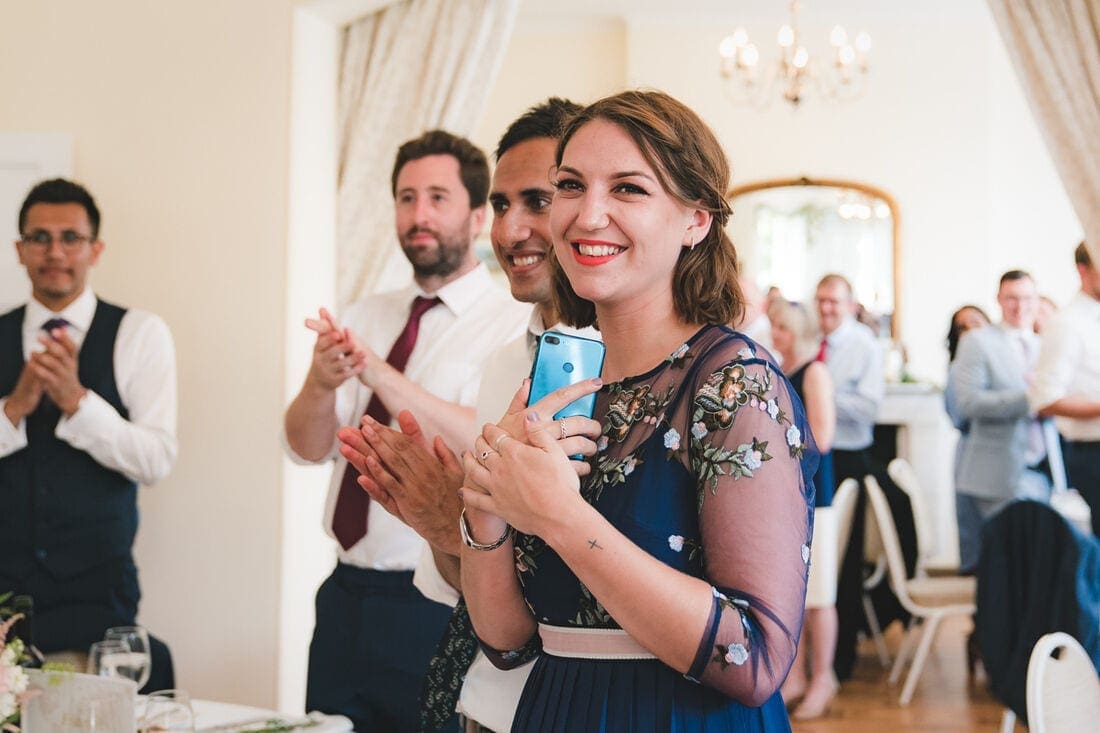 On the day of a wedding, particularly if I’m there to photograph the build up before the ceremony, I usually get a very strong sense of what kind of a wedding is to come. It’s a really important part of the day for me, as I believe that the documentary approach to photography that I so strongly believe in, is not just about photographing things as they happen, but is about tapping into what makes every wedding unique. On this occasion, I was struck by two things in particular. Firstly was a string of family photos that Ellie and Jamie had strung up at Pembroke Lodge for their friends and family to enjoy as they arrived (the photo below shows a touching moment with Jamie’s mum and aunt.) The other moment was on the car journey with Ellie and her father from The Petersham Hotel to Pembroke Lodge. In the black and white photo below, you might just be able to make out dad’s phone resting on his knee, which he used to play an assortment of tunes, with the aim of calming his daughter’s nerves on the way to the ceremony. This lovely bond between the two of them was again in evidence during a brilliant joint speech between Ellie’s mum and dad done in the style of The Chuckle Brothers, “To me, to you!”