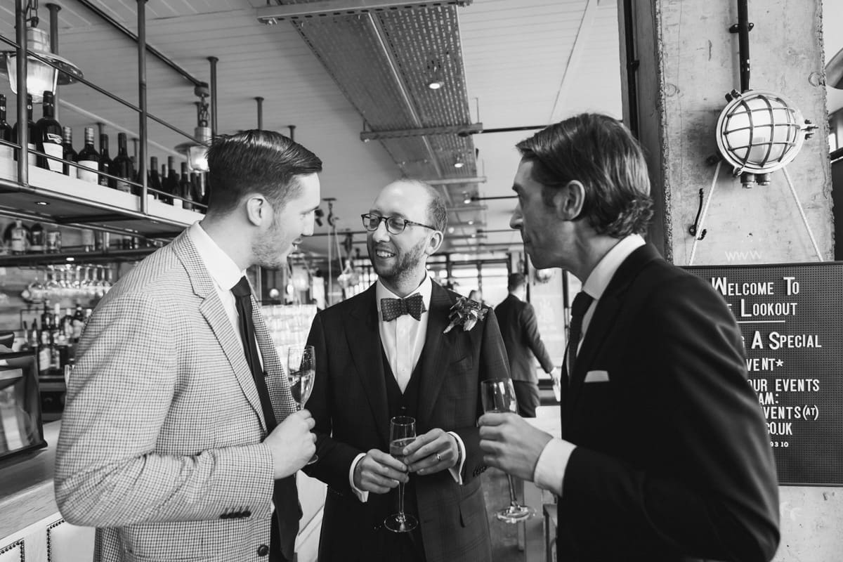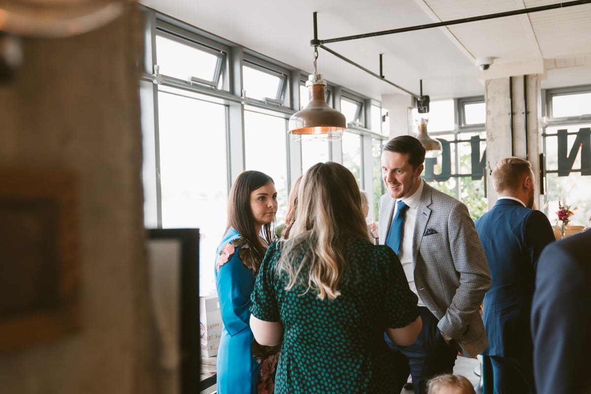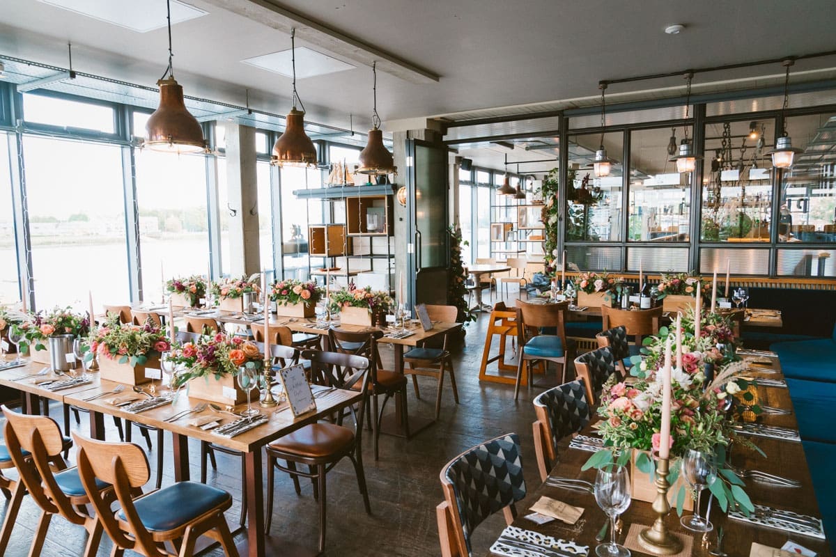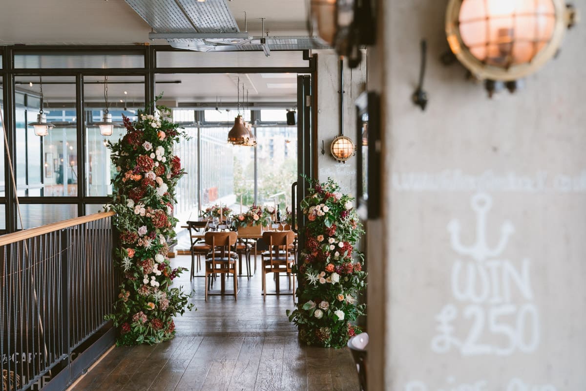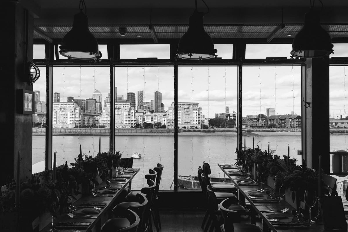 It wasn’t until much later in the afternoon that we made the short walk along the River Thames to The Sail Loft, that describes itself on their website as, “Serving up fresh food and fabulous drinks with a side order of stunning views. Drink or dine at the water’s edge courtesy of our beautiful outdoor terrace, or enjoy the panoramic cityscape from our first-floor dining area.” For this wedding reception the couple had indeed hired the whole of the first floor, and as you can see for some of my pictures below, the positioning on the banks of the Thames does indeed lead to a stunning view in both directions along the river. As for the interior, the nautical/industrial vibe of the decor gives the space a very modern edge, whiles also giving a nod to the seafaring heritage of the area, and the beautiful flower arrangements that you see below were all done courtesy of the wonderful Hannah Jordan Flowers who’s wedding I happen to hae photographed a few years earlier at Clifton Nurseries.